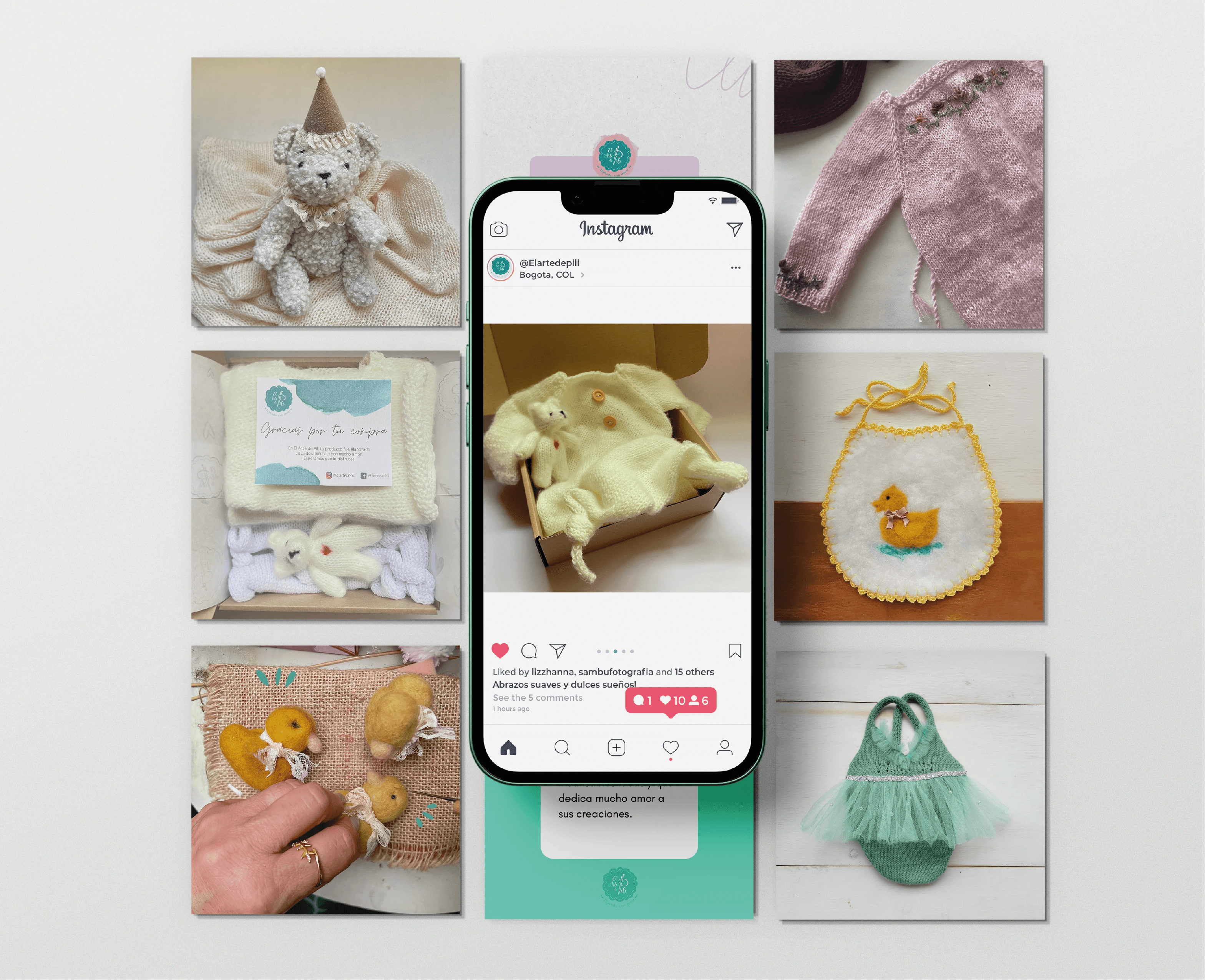 El Arte de Pili is a handmade brand dedicated to creating knitted outfits for newborn photography. The project focused on building a warm and cohesive visual identity that reflects the care, craftsmanship, and emotional value behind each handmade piece.